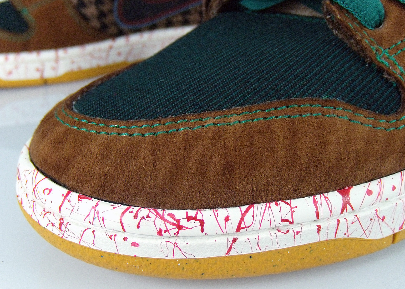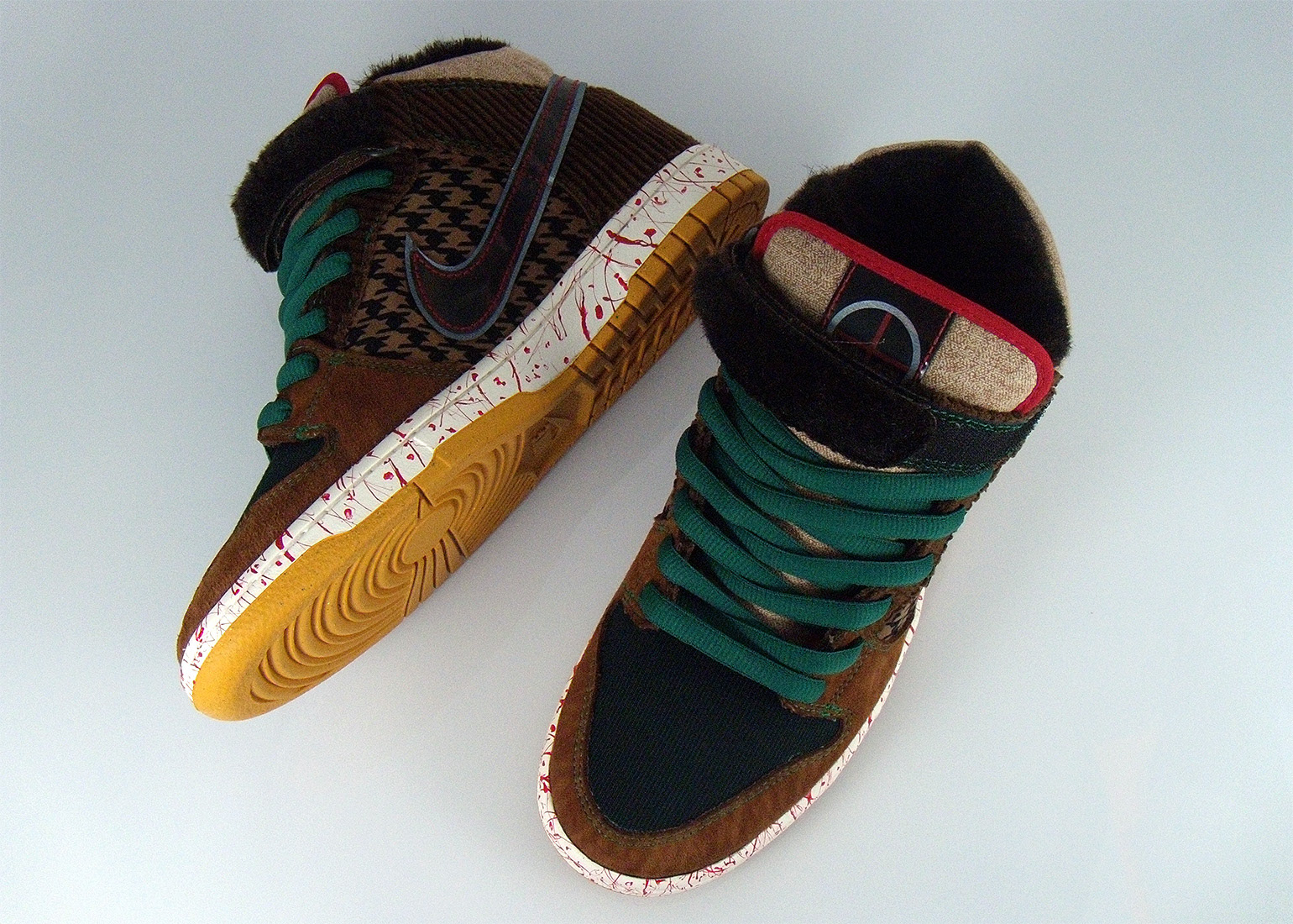 Info: English GameKeepers Nike Dunk Mid SB, made for Miguel Rodriguez. The shoes feature Brown suede, Corduroy, and Fur. Contrast Green stitching along with metallic brushed double swoosh, and of course red-blood splattered sole. Lots of nice little details here and there!